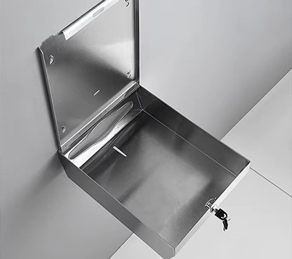 This modern BFG700 Lockable Towel Dispensers stainless steel silver toilet tissue dispenser is wall-mounted, lockable, and designed for high-end markets. It features a capacity of 500 multi/tri-fold tissues, a sleek polished/brushed/black/white finish, and customizable packing options. Ideal for hotels, it combines durability with a stylish design.